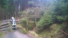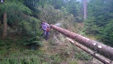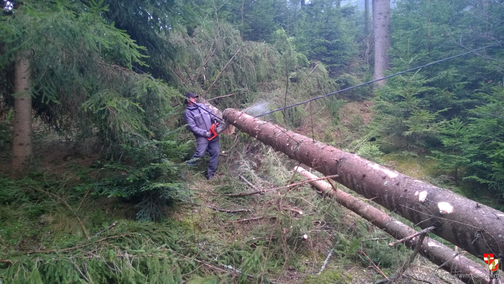 Am Einsatzort angekommen, ergab die Erkundung, dass zwei Bäume über den Weg und einer Stromleitung zu liegen kamen. Daraufhin verständigten wir die EVN und warteten auf ihr eintreffen. Nach den Eintreffen des Mitarbeiter der EVN entfernten wir gemeinsam mit ihm die Bäume von der Leitung und des Verkehrsweges. Mittels Seilwinde vom Tanklöschfahrzeug wurden die Baumstämme von der Fahrbahn gezogen.