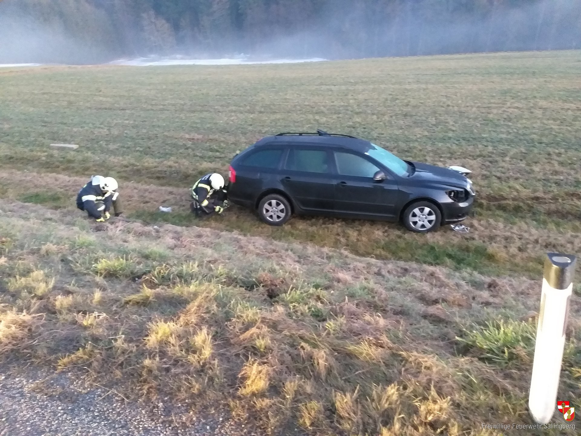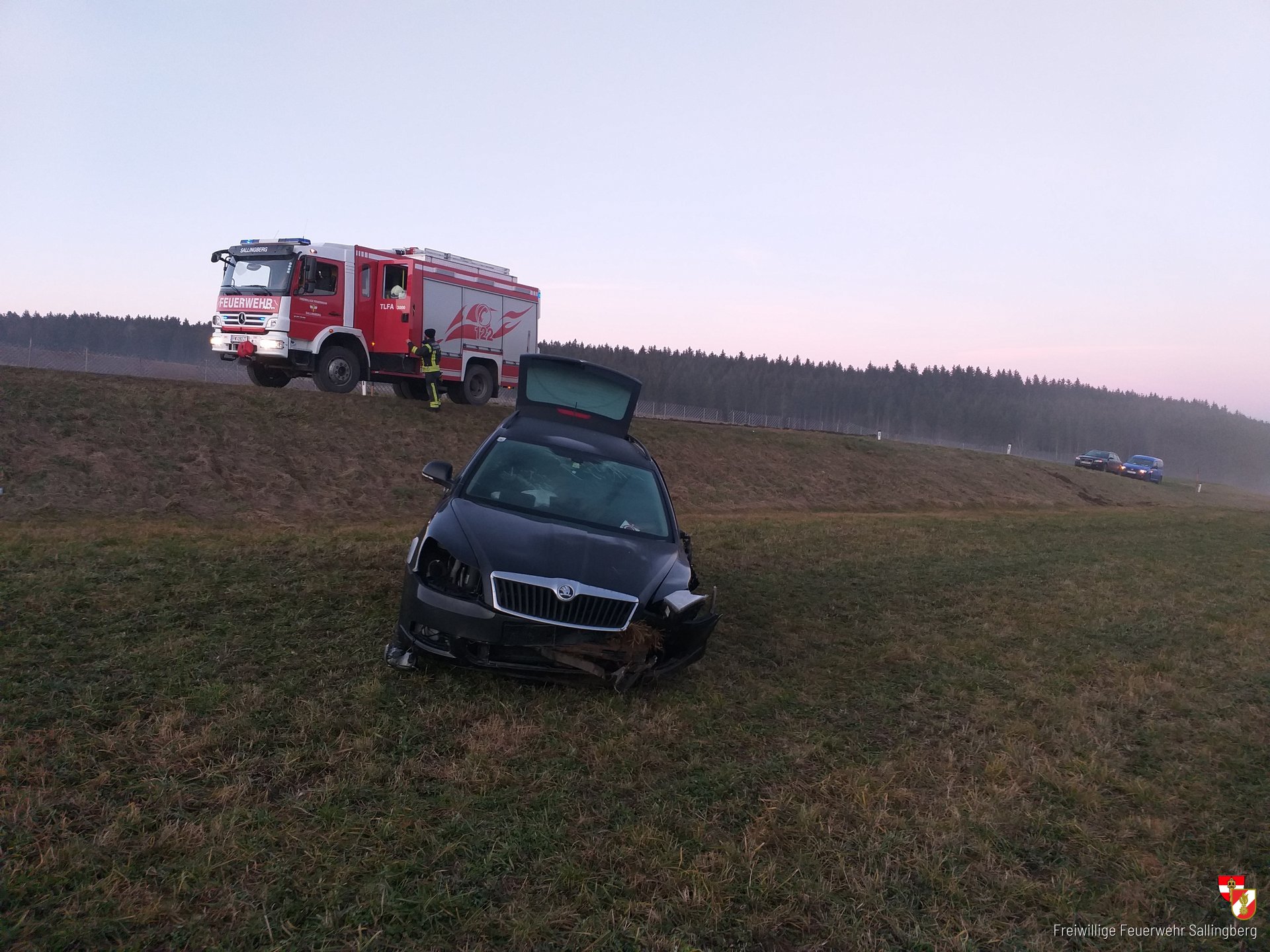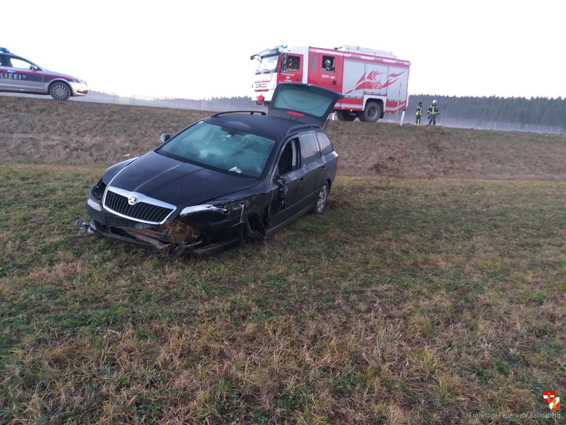 Unter der Führung von Zugskommandant HBM Christian Schulmeister rückten umgehend 8 Mitglieder der FF Sallingberg mit TLF-A 3000 und MTF-A zur Einsatzstelle auf der Landesstraße Richtung Armschlag aus. Bei der Ankunft an der Einsatzstelle bat sich unseren Einsatzkräften folgendes Bild: Ein PKW stand nach einen Verkehrsunfall in der angrenzende Wiese, ein Vorderrad ist abgerissen, Polizei bereits vor Ort.
