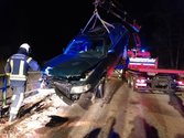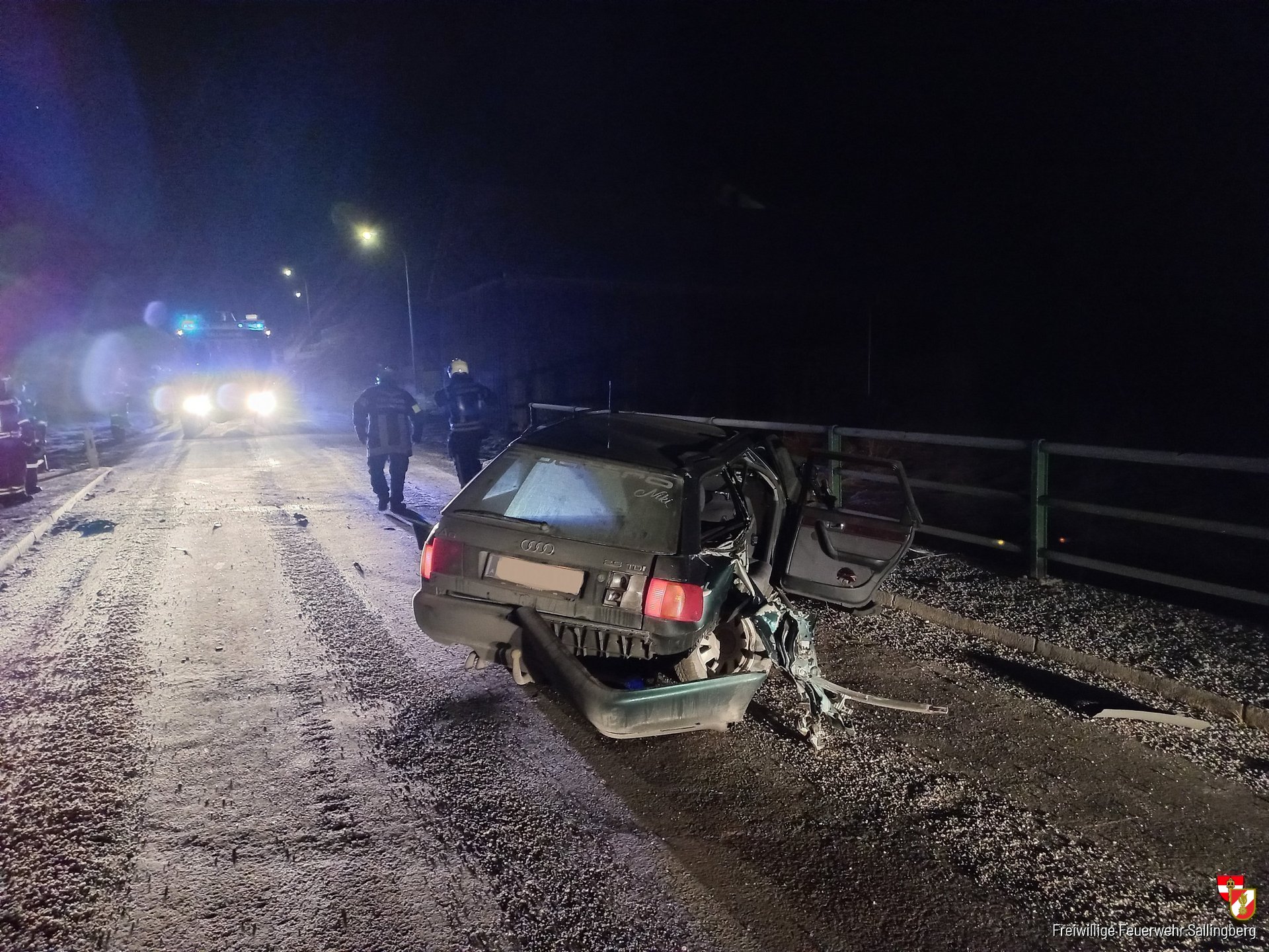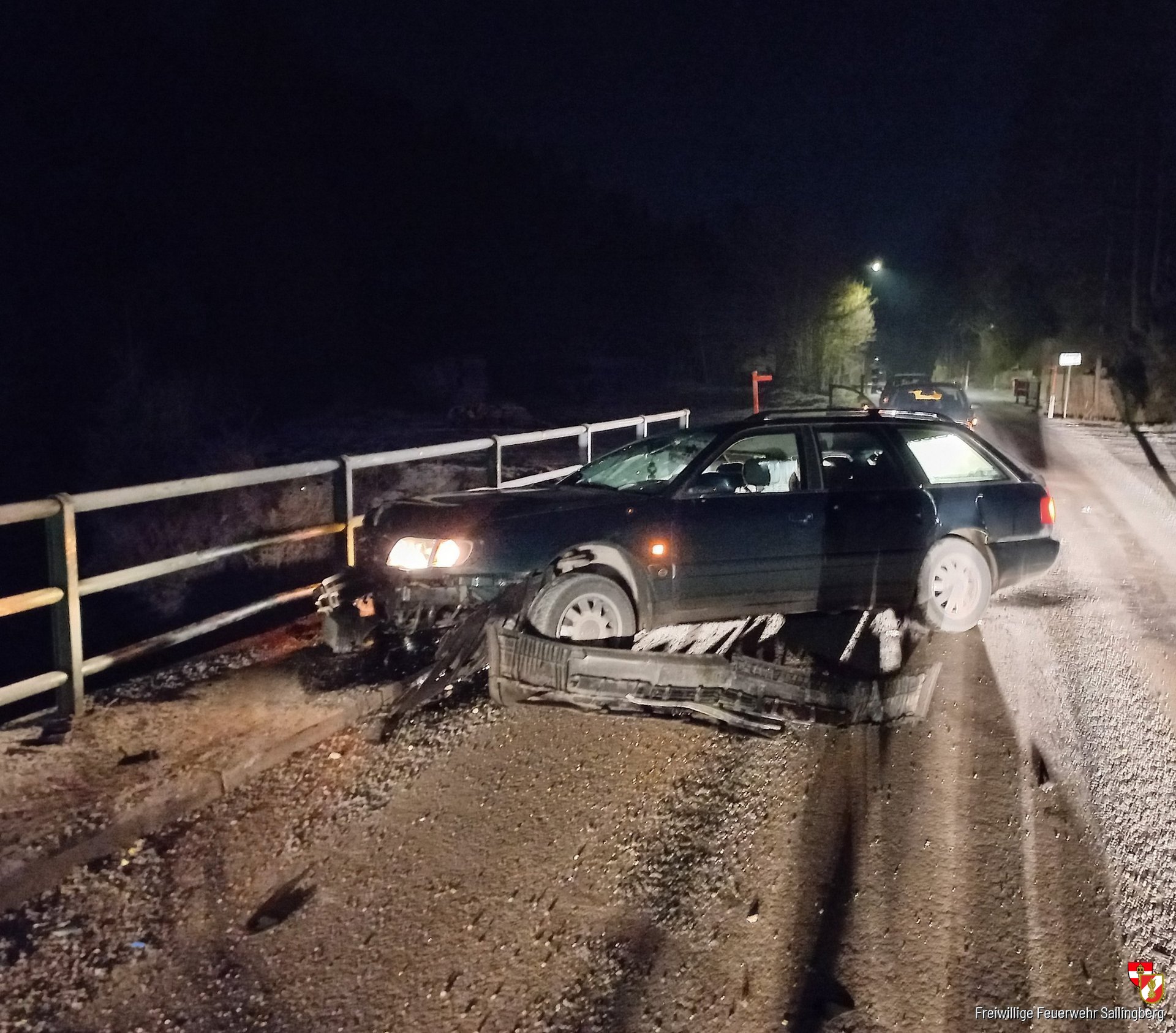 Trotz des Umstandes, dass die ehrenamtlichen Mitglieder aus ihren Schlaf gerissen wurden, rückten wir nach wenige Minuten mit beiden Einsatzfahrzeuge zur angegebenen Einsatzadresse aus. Die eintreffenden Einsatzkräfte fanden folgendes Bild an der Unfallstelle vor, ein schwer beschädigter PKW stand schräg auf der Fahrbahn und sämtliche Betriebsmittel traten aus. Von den Feuerwehrmitgliedern wurde die Einsatzstelle abgesichert und begonnen die ausgeflossenen Betriebsmittel zu binden. Zur Bergung für das Unfallfahrzeug forderten wir die FF Grafenschlag zur Einsatzadresse nach. Mit ihrer Unterstützung, mittels Wechseladefahrzeug mit Kran, konnte der PKW von der Brücke entfernt werden. Abschließend reinigten wir noch die Fahrbahn von den Fahrzeugteilen und ausgeflossen Flüssigkeiten.