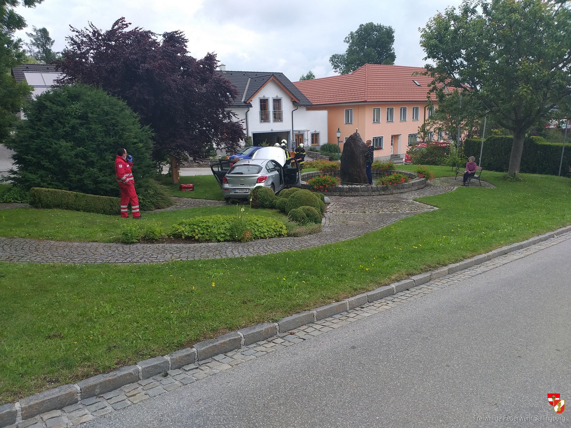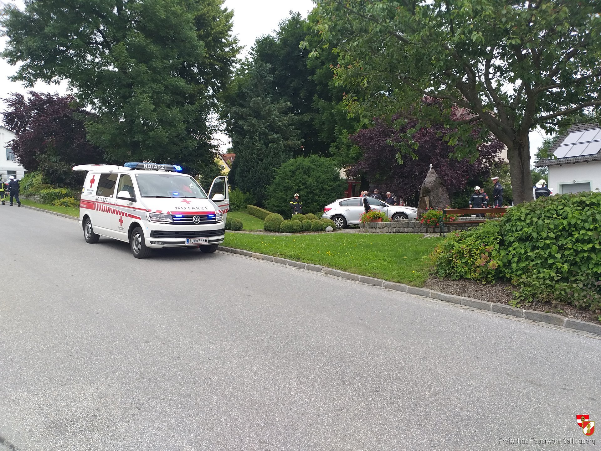 Unter der Führung von Feuerwehrkommandant OBI Gerhard Freistetter rückten umgehend 14 Mitglieder der FF Sallingberg mit TLF-A 3000 und MTF-A zur Einsatzstelle im Sallingberger Ortsgebiet aus. Bei der Ankunft an der Einsatzstelle bat sich unseren Einsatzkräften folgendes Bild: Ein Lenker ist mit seinem PKW von der Fahrbahn abgekommen und kam im Park an die Umfassungsmauer des Marktbrunnen mit seinen Fahrzeug zum Stillstand.