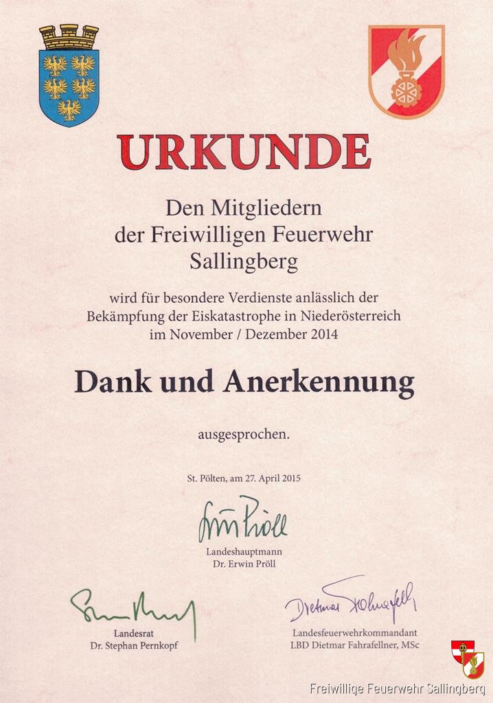 Für die erbrachte Leistung und Einsatzbereitschaft überreichten Landesrat Stephan Pernkopf und Landesfeuerwehrkommandant Dietmar Fahrafellner am 27. April 2015 eine Dankesurkunde an Feuerwehrkommandant Gerhard Freistetter stellvertretend für die eingesetzten Mitglieder unserer Wehr.