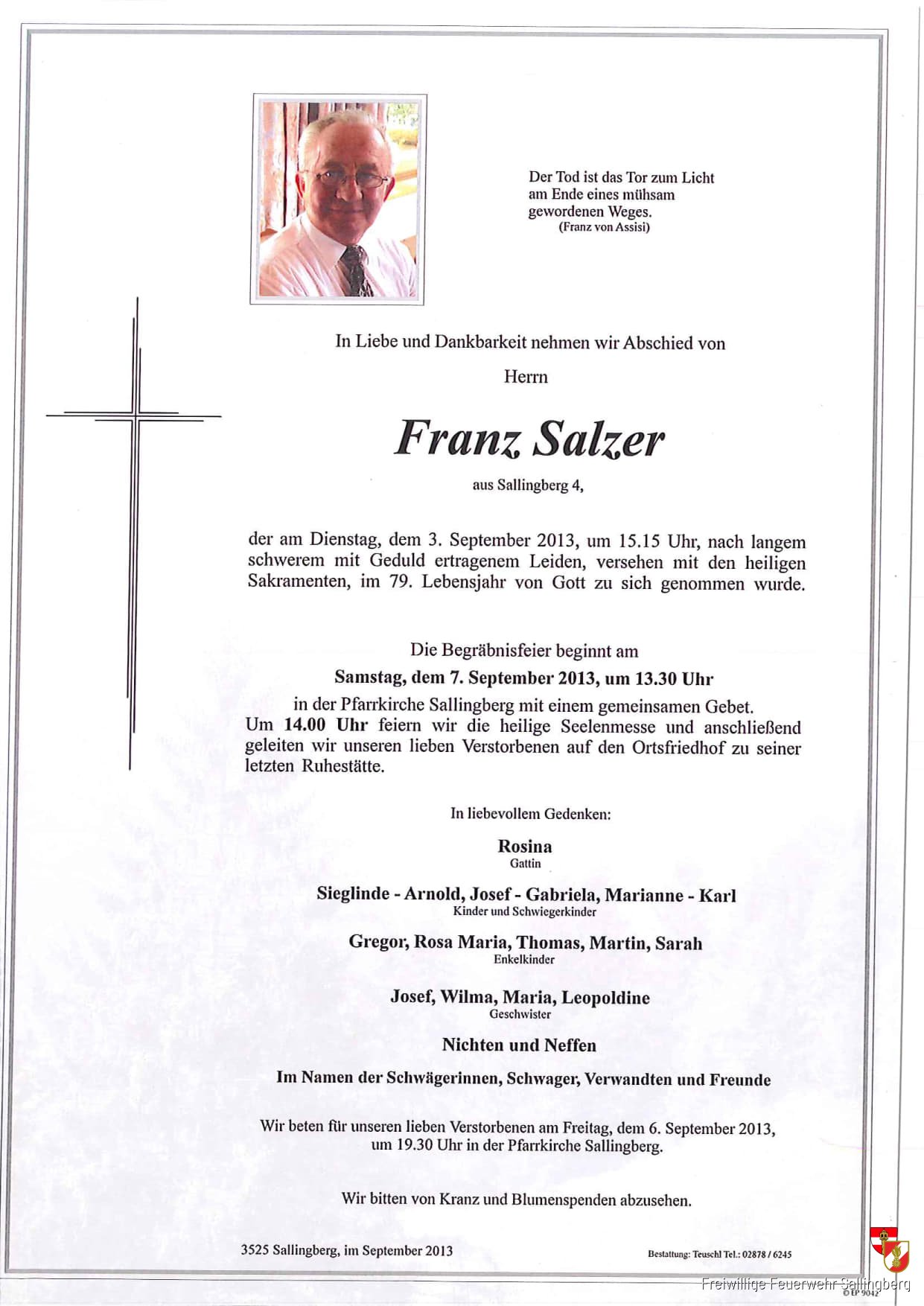 EBI Franz Salzer starb im Alter von 79 Jahren. Er hinterlässt seine Frau Rosina, sowie drei Kinder. Mit Franz verliert unsere Wehr einen beliebten, hilfsbereiten und gewissenhaften Kameraden. 1971 trat er der Freiwilligen Feuerwehr Sallingberg bei, besuchte zahlreiche Kurse und wurde 1975 zum Feuerwehrkommandanten gewählt. Diese Funktion hatte er bis zum 21.01.1979 inne. Er war durch sein Engagement immer eine wertvolle Stütze in unserer Wehr. Vor allem bei den zahlreichen Tätigkeiten (Einsätze, Übungen, Feste und Feuerwehrhausbau) konnte man immer auf seine Mithilfe zählen. Für seine erbrachten Leistungen wurde er seitens des Landes Niederösterreich und des Niederösterreichischen Landesfeuerwehrverbandes ausgezeichnet. Sein Tod hinterlässt eine große Lücke in unserer Mannschaft.