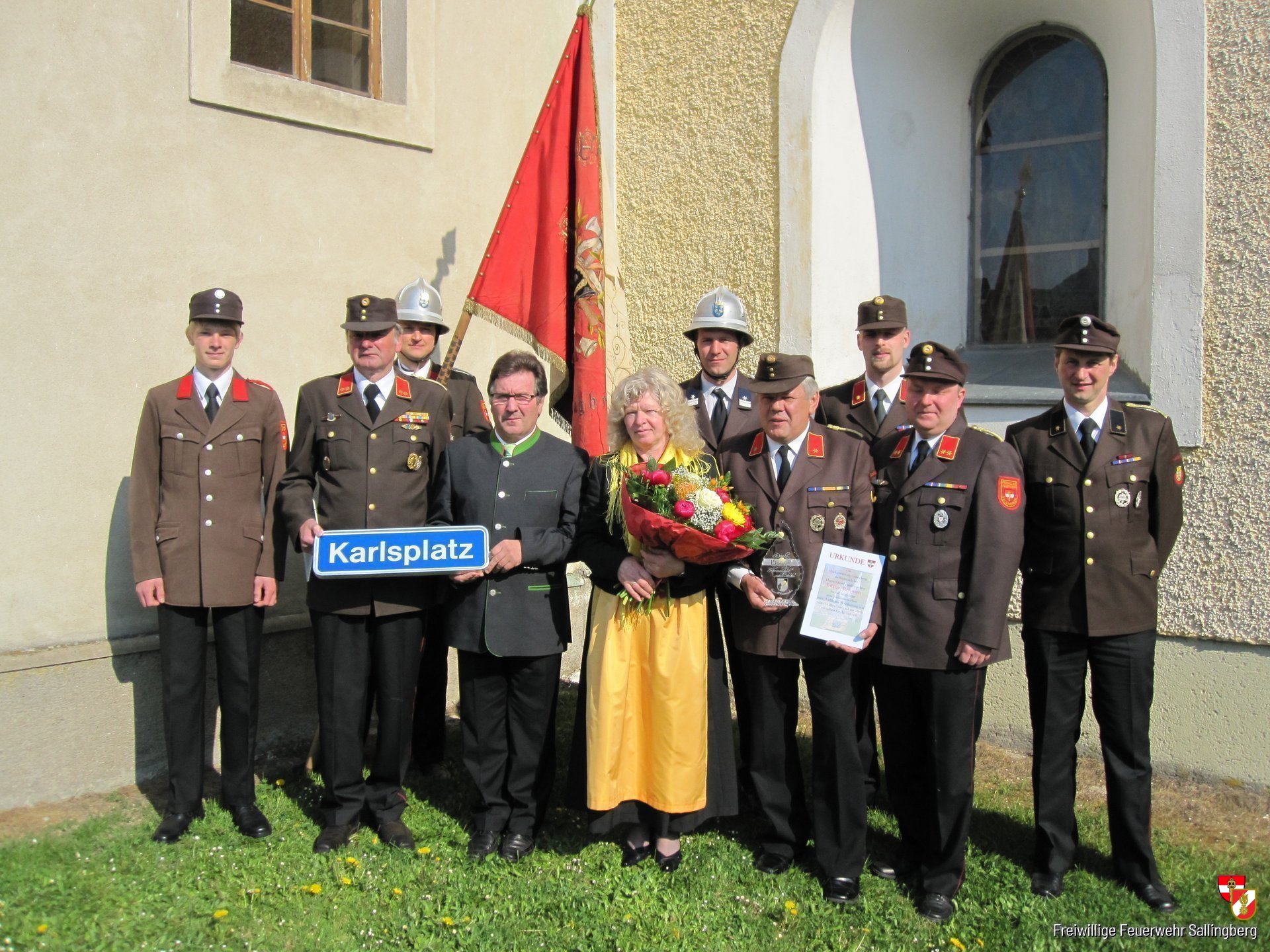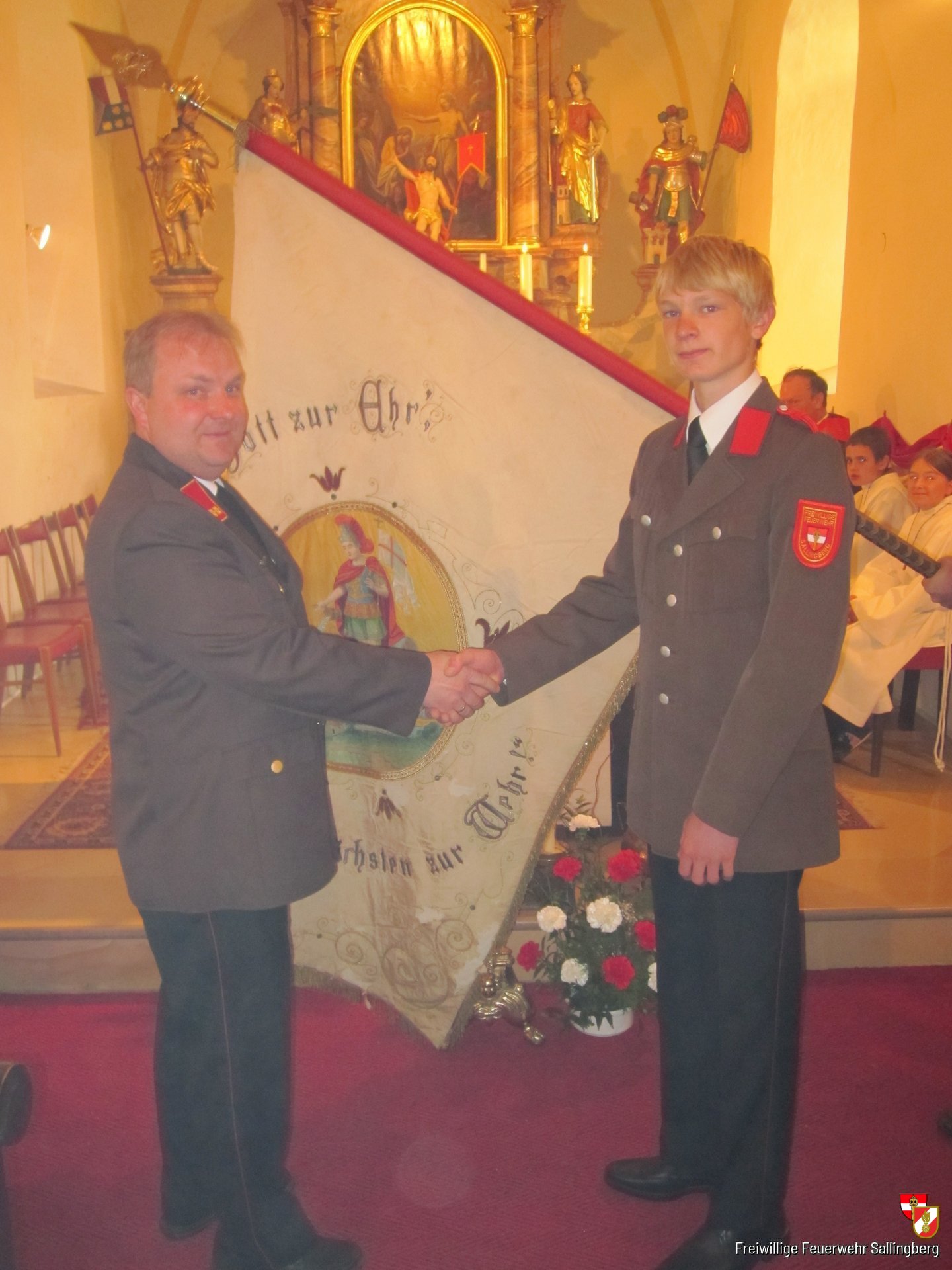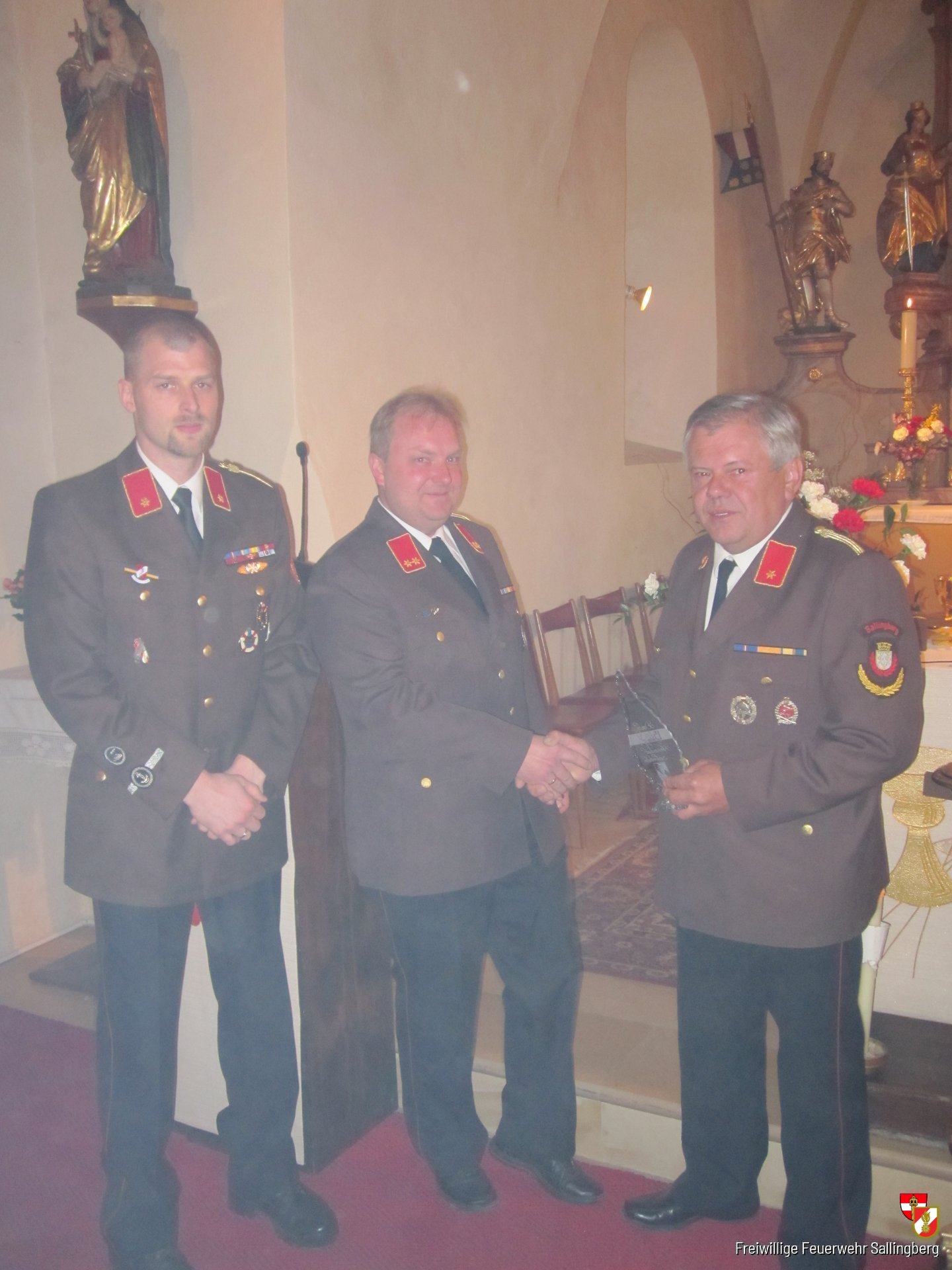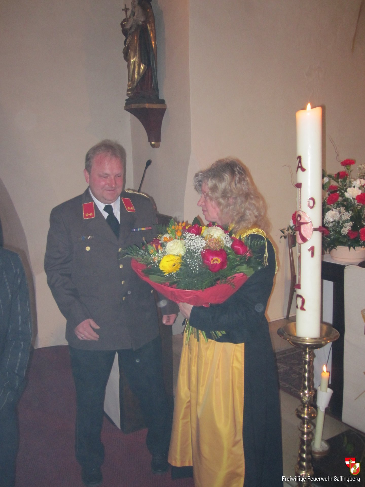 Im Anschluss an die Messe wurde PFM Lukas Schulmeister vom Feuerwehrkommandanten OBI Gerhard Freistetter angelobt. OBI Gerhard Freistetter gedachte auch in seiner Ansprache an die verstorben Kameraden LM Josef Kaufmann, LM Josef Freistetter und LM Josef Kolm, die im letzten Jahr von uns gegangen sind. In seiner Rede bedankte er sich bei Frau Maria Schulmeister, EOBI Karl Schulmeister (Feuerwehrkommandant 1996 - 2011) und EBI Johann Reisinger (Feuerwehrkommandantstellvertreter 1996 - 2011) für die erbrachten Leistungen und überreichten kleine Präsente bzw. Blumengruß. Bürgermeister Leopold Bock bedankte sich bei EOBI Karl Schulmeister und EBI Johann Reisinger im Namen der Marktgemeinde Sallingberg für die gute Zusammenarbeit in deren Funktionsperioden und deren Leistungen und überreichte eine Dankesurkunde.