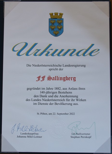 Am 22. September 2022 überreichten Landeshauptfrau Johanna Mikl-Leitner, LH-Stellvertreter Stephan Pernkopf und Landesfeuerwehrkommandant - Stellvertreter Martin Boyer im Rahmen eines Festaktes im NÖ Feuerwehr- und Sicherheitszentrum die Jubiläumsurkunde des Landes Niederröstereich an die Feuerwehr Sallingberg.