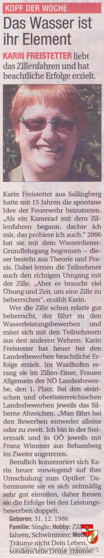 In der Wochenzeitung NÖN, Ausgabe für den Bezirk Zwettl, vom 21.09.2011 (Woche 38) ist OFM Karin Freistetter der "Kopf der Woche"