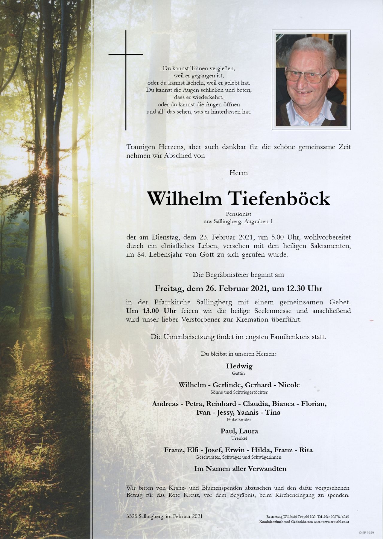 LM Wilhelm Tiefenböck starb im 84. Lebensjahr. Er hinterlässt seine Frau Hedwig, sowie 2 Kinder. Mit Wilhelm verliert unsere Wehr einen beliebten, hilfsbereiten und gewissenhaften Kameraden. 1968 trat er der Freiwilligen Feuerwehr Sallingberg bei. Er war durch sein Engagement immer eine wertvolle Stütze in unserer Wehr. Vor allem bei den zahlreichen Tätigkeiten konnte man immer auf seine Mithilfe zählen, besonders sei das Mitwirken beim Bau des Feuerwehrhauses hervorzuheben. Für seine erbrachten Leistungen wurde er seitens des Landes Niederösterreich ausgezeichnet. Sein Tod hinterlässt eine große Lücke in unserer Mannschaft.