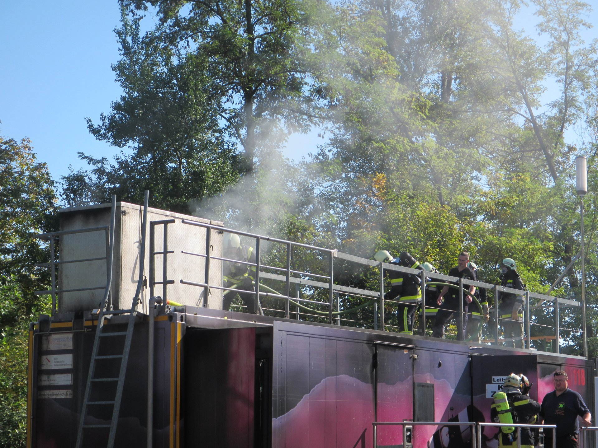 Diese Ausbildung umfasst mehrere Themenbereiche, zuerst werden in einen Theorieblock die Ausbildungsstufen im Bereich Atemschutz und eine Sicherheitsbelehrung durchgeführt. Anschließend wurde die Handhabung des Hohlstrahlrohres erklärt und beübt und wie man sich die nötigen Schlauchreserven (auslegen in Buchten oder Loops) für einen Innangriff vorbereiten kann. Danach ging es für alle Teilnehmer mit der entsprechenden persönlichen Schutzausrüstung (Einsatzbekleidung mit schwerem Atemschutz) zur Wärmegewöhnung in den Container, dabei ging es die Temperaturunterschiede in den unterschiedlichen Höhen zu spüren (zwischen Deckenbereich und Boden).