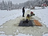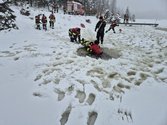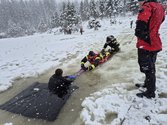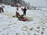 Mit der notwendigen Eigensicherung in Form einer Rettungsweste ging es dann zum Schlesingerteich. Am Schlesingerteich angekommen herrschten annähernd einsatznahe Verhältnisse. Zwar war das Eis stark genug (ca. 25 cm), jedoch befanden sich auf dem Eis noch ca. 20 cm Neuschnee bzw. 10 cm nicht gefrorenes Wasser, welches nach oben gedrückt wurde. Nach kurzem Zögern, jedoch mit dem nötigen Ernst der Lage im Hinterkopf, entwickelte sich mit viel Spaß und enormen Engagement ein wahrer „Einsatz-Ehrgeiz“.
