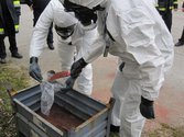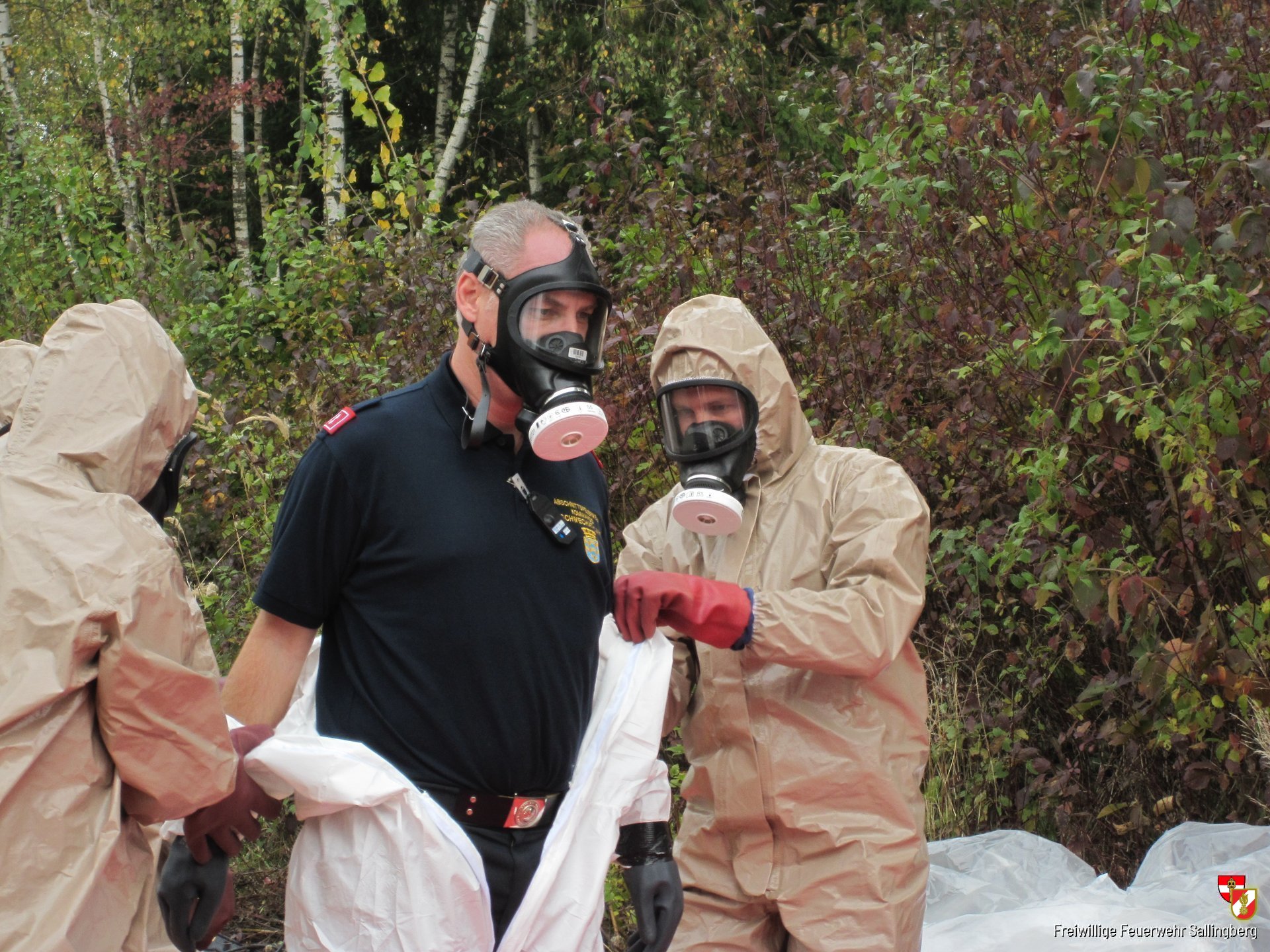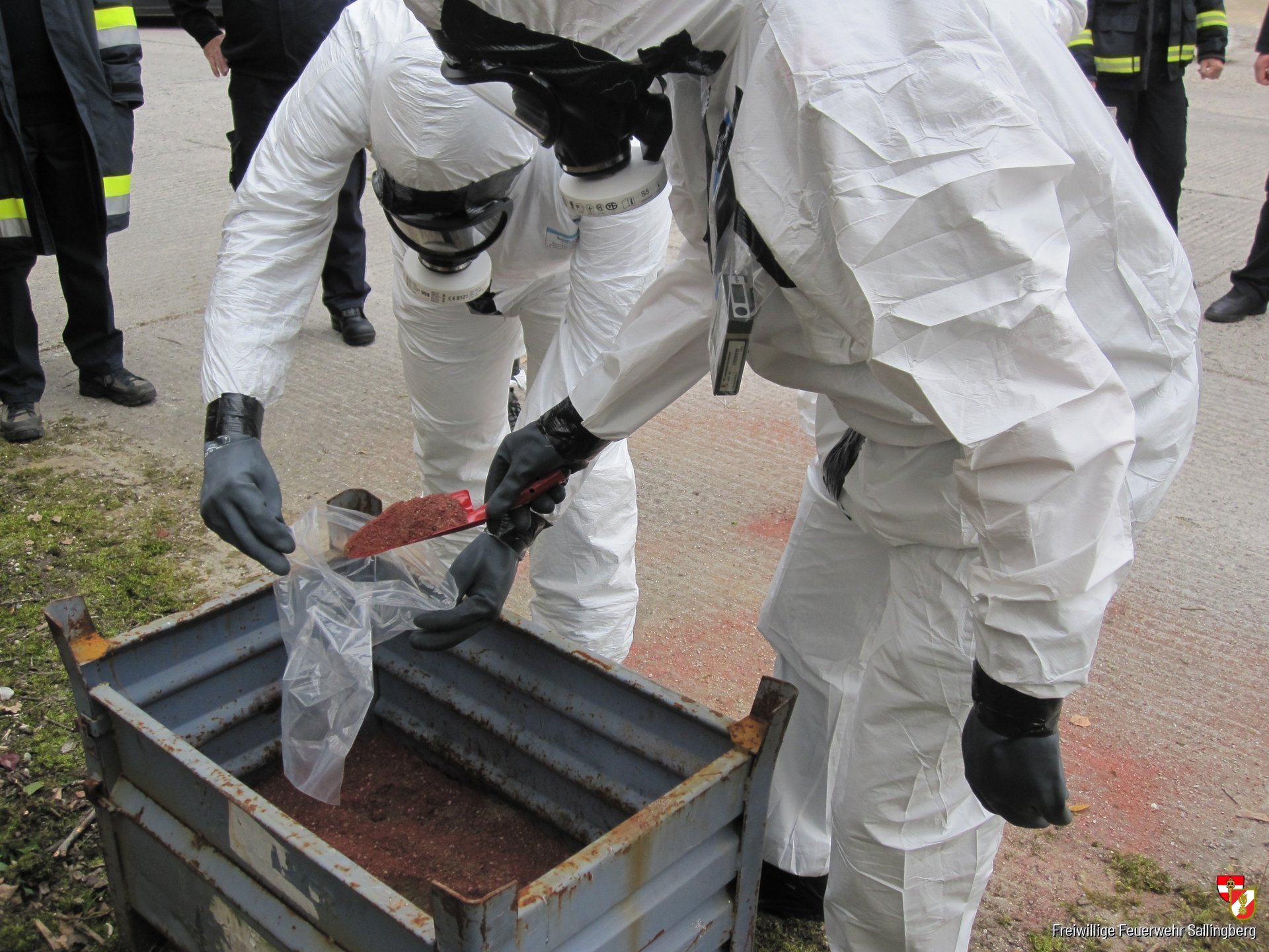 Bei den Probenahmen unter Schutzstufe wurde sehr hoher Wert auf das sorgfältige Anlegen des Schutzanzuges gelegt. Hierbei wurde unter größter Sorgfalt eine Bewuchs- bzw. Erdprobe genommen und verpackt. Dies dient im Ernstfall zur Feststellung der tatsächlichen radioaktiven Belastung der einzelnen Gebiete.