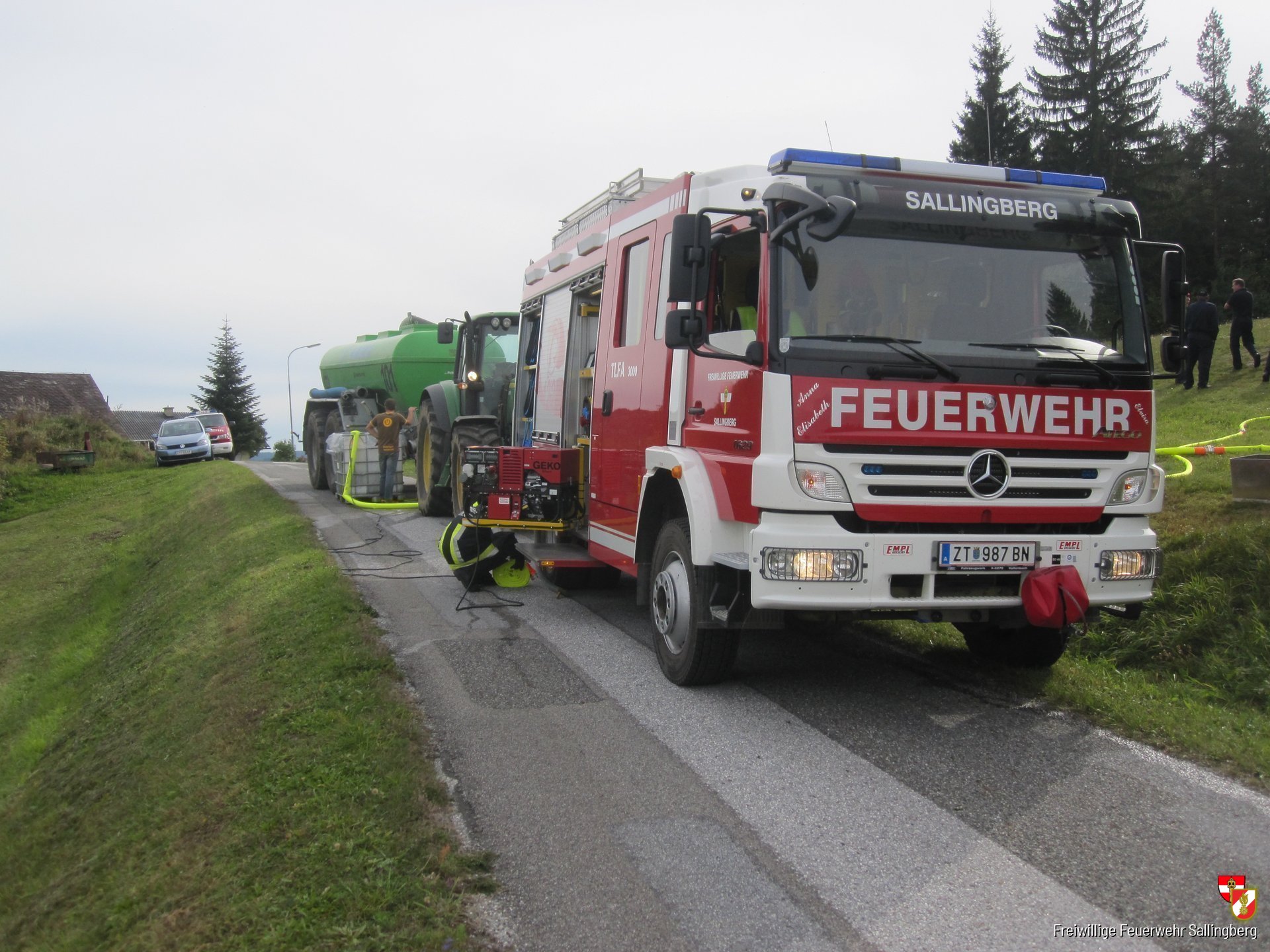 Als wir mit unserem Tanklöschfahrzeug an der Übungsstelle ankamen, erteilte uns BI Manfred Maier den Befehl die Wasserversorgung zum Tank Grafenschlag herzustellen. Den Waldbrand mittels einem Strahlrohr zu bekämpfen. Darauf bauten wir eine Löschleitung zur Brandbekämpfung und eine Zubringleitung zu Tank Grafenschlag zur Wasserversorgung auf. Das benötigte Löschwasser wurde in einem Vakuumfass bereitgestellt, von diesen floss das Wasser in einen Behälter und wurde mittels einer Unterwasserpumpe weiter befördert.