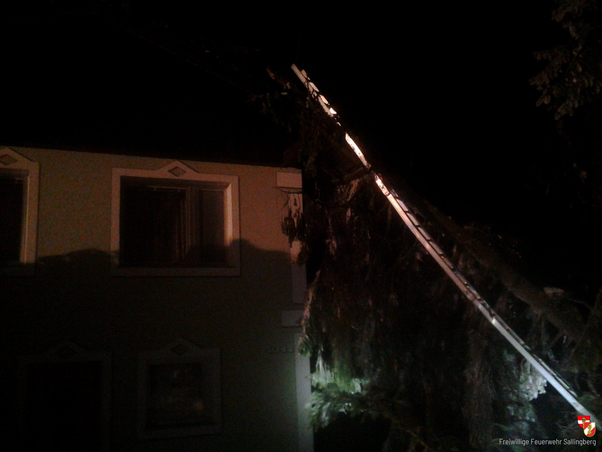 Die erste Alarmierung durch Florian Zwettl erfolgte um 5.52 Uhr mit dem Alarmtext "Baum auf Haus in Sallingberg“. Umgehend rückten wir zur angegebenen Einsatzadresse aus. Bei der Erkundung am Einsatzort stellte der Einsatzleiter fest, dass eine 25m lange Fichte auf dem Hausdach liegt. Beim Versuch, den Baum vom Dach zu entfernen, stürzten weitere Baumwipfel in unmittelbarer Nähe zu Boden. Um die Arbeiten durchführen zu können, wurde das Kranfahrzeug der Feuerwehr Ottenschlag zur Unterstützung angefordert. Gemeinsam entfernten die Einsatzkräfte die Baumteile. Nach rund zweieinhalb Stunden konnten wir wieder einrücken.