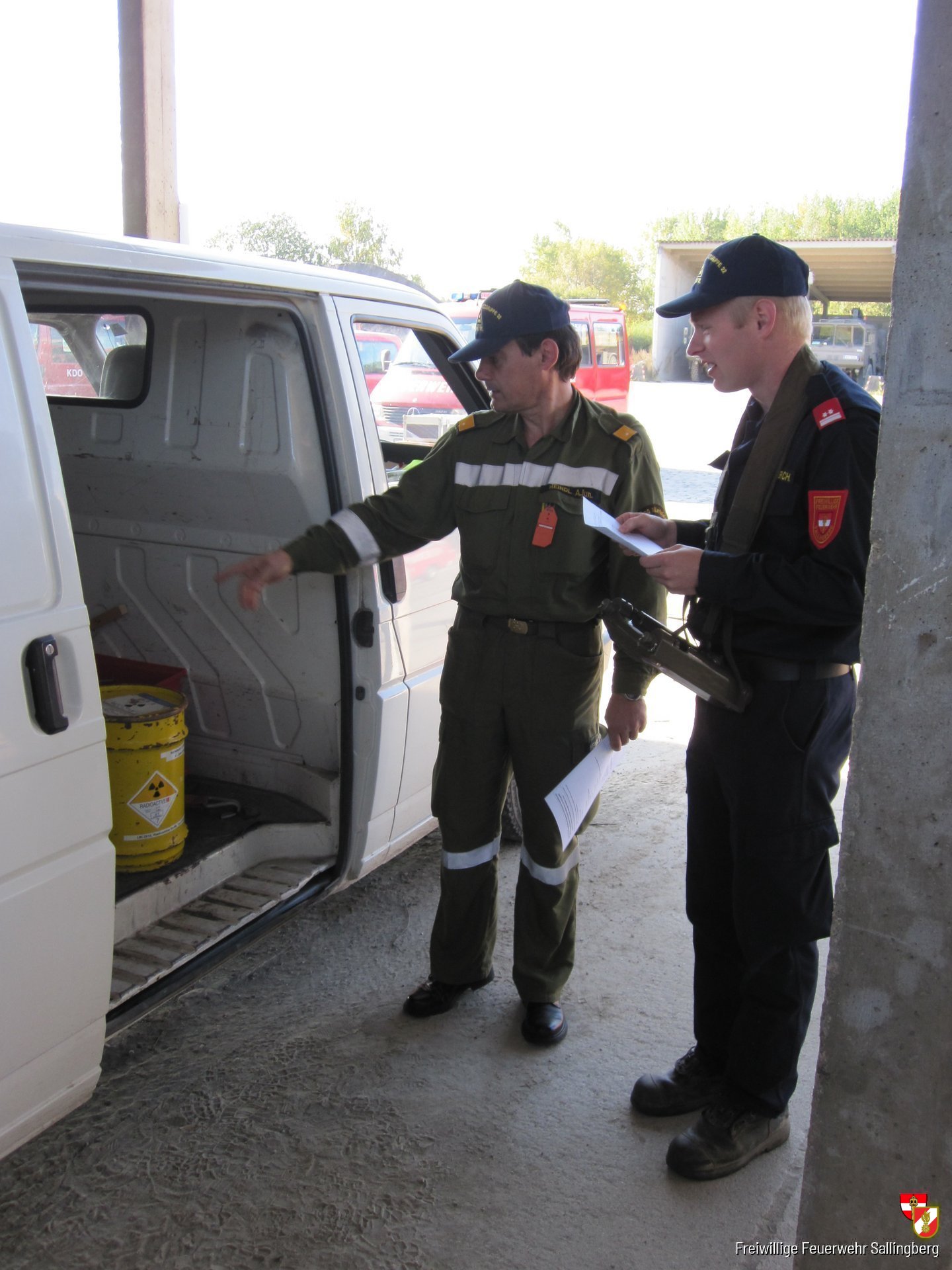 Ein ADR – Transporter mit verschiedenen Transportbehältern für radioaktive Stoffe, welche unzureichend gesichert waren, war die Schadenslage der zweiten Station. Schwerpunkte waren das Kennen lernen der Begleitpapiere, der Kennzeichnungen der Behälter sowie der anwendbaren Einsatztaktik.
