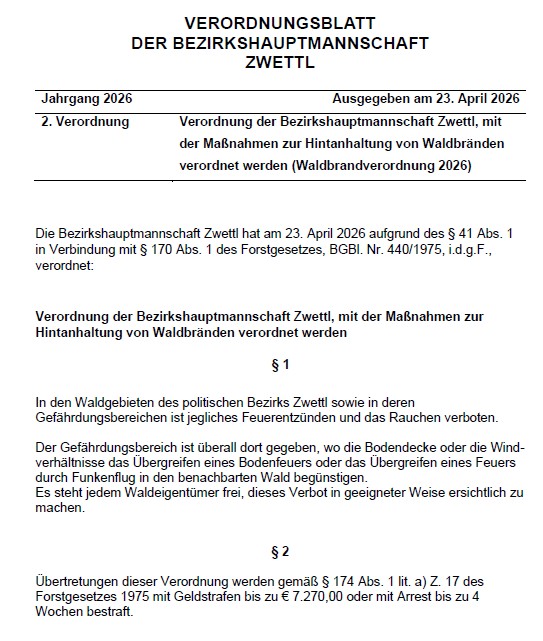Die Bezirkshauptmannschaft Zwettl hat zur Maßnahmen der Hintanhaltung von Waldbränden gemäß Forstgesetz, in den Waldgebieten des politischen Bezirks Zwettl, sowie in deren Gefährdungsbereichen, das jegliches Feuerentzünden und Rauchen verboten. Der Gefährdungsbereich ist überall dort gegeben, wo die Bodendecke oder die Windverhältnisse das Übergreifen eines Bodenfeuers oder das Übergreifen eines Feuers durch Funkenflug in den benachbarten Wald begünstigen.